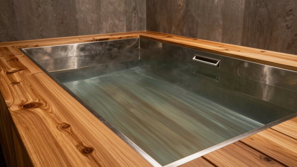 Stainless steel acts like a knight, standing firm against corrosion over time. It offers superior corrosion resistance thanks to its alloy composition, making it highly durable in wet environments. Compared to other materials, stainless steel’s material durability guarantees it resists rust and deterioration, even after repeated cold plunges. So, if you’re seeking longevity and resilience, stainless steel surfaces are a smart choice for your cold plunge, standing strong against the elements.