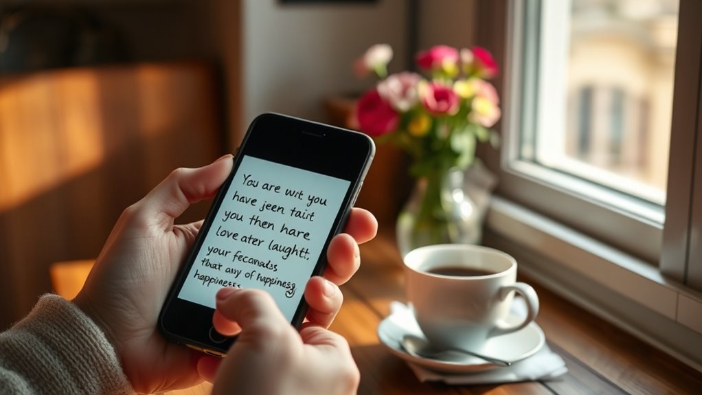 Sending a loving text or note during the day is a simple yet powerful way to strengthen your connection. Regular texting consistency shows your partner you’re thinking of them, even during busy moments. Handwritten notes add a personal touch that digital messages can’t match, making your gestures more meaningful. These small acts create moments of closeness and reassurance, reinforcing your bond throughout the day.