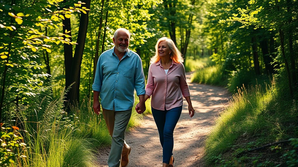 Taking a short walk together is a simple yet powerful way to strengthen your connection. As you stroll side by side, you create space for walking conversations that deepen understanding and foster closeness. Outdoor bonding allows you to escape daily routines and distractions, making it easier to focus on each other. During these walks, you can share thoughts, dreams, or even just enjoy each other’s company in silence. The fresh air and natural surroundings help both of you relax, reducing stress and increasing positive feelings. Even a quick 10-minute walk can boost your emotional intimacy and remind you why you’re a team. Incorporating privacy and cookie management into your routine can help you stay mindful of online boundaries while enjoying these moments together. By making these walks a regular habit, you nurture your relationship one step at a time.