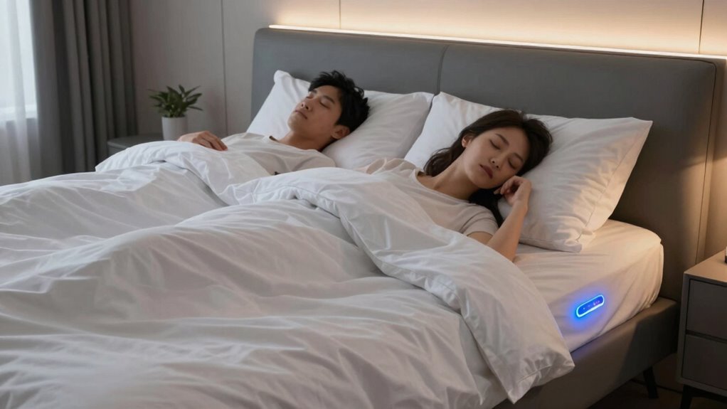 As a couple, you can benefit from these innovations by customizing your side of the bed. If one of you tends to run hot and the other cold, temperature control beds provide a solution that caters to both needs simultaneously. This personalized comfort is vital because shared beds often become a battleground for temperature disputes, which disrupt sleep. With individual controls, you both can maintain your preferred climate, leading to fewer disturbances and a more peaceful, uninterrupted night. Recognizing how personalized comfort influences sleep can further underscore the benefits of these beds in fostering harmony and restful nights.