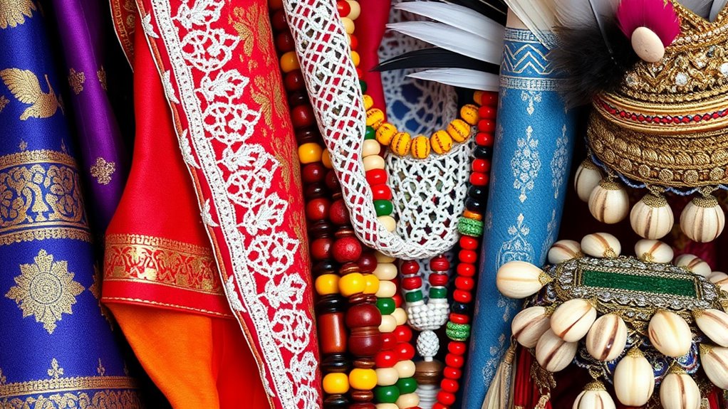Across cultures, wedding attire often reflects vibrant traditions and bold expressions of identity. You’ll notice how traditional textiles play a vital role in creating striking ceremonial costumes. These garments showcase intricate patterns, bright colors, and unique craftsmanship passed down through generations. For example, in India, brides wear richly embroidered sarees or lehengas made from luxurious fabrics, while in Africa, Maasai warriors don shúkà robes with beaded jewelry. In Japan, brides wear colorful kimonos adorned with elaborate designs, and in Peru, wedding outfits feature vibrant textiles woven with symbolic motifs. These garments are more than just clothing; they embody cultural stories, history, and community pride. By wearing such vibrant cultural garments, you celebrate your heritage and make your wedding a vivid reflection of your identity. Additionally, the textile craftsmanship involved in creating these outfits often incorporates traditional techniques that have been preserved for generations.