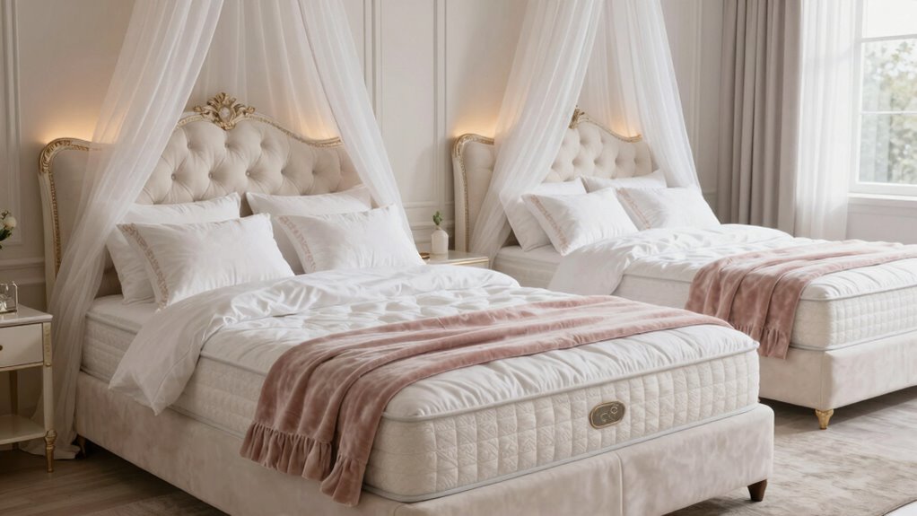 Luxury mattresses markedly improve sleep quality for couples by providing superior support and comfort. I’ve found that they reduce partner disturbance, thanks to advanced motion isolation features, so I sleep uninterrupted. The high-quality materials and customizable firmness levels help me wake up refreshed and pain-free. Overall, investing in a luxury mattress creates a more restful, romantic, and rejuvenating sleep experience for both of us, making every night more enjoyable.