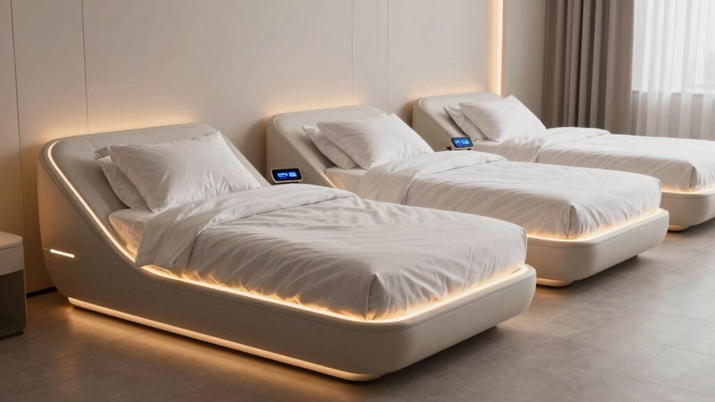Yes, smart beds can automatically adjust for couples’ different comfort preferences. I love how sensors detect individual movements and pressure points, then adapt each side of the bed accordingly. This personalized comfort guarantees both partners sleep peacefully without compromising. With seamless adjustments, I find it easier to get better rest and intimacy, knowing the bed caters to our unique needs effortlessly. It’s truly a game-changer for couples seeking harmony and comfort.